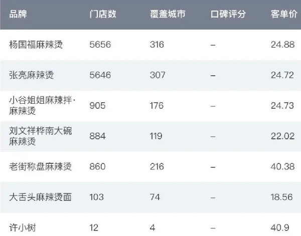 大舌頭麻辣燙面和許小樹的門店數量則少瞭許多,分別僅為103傢和12傢。