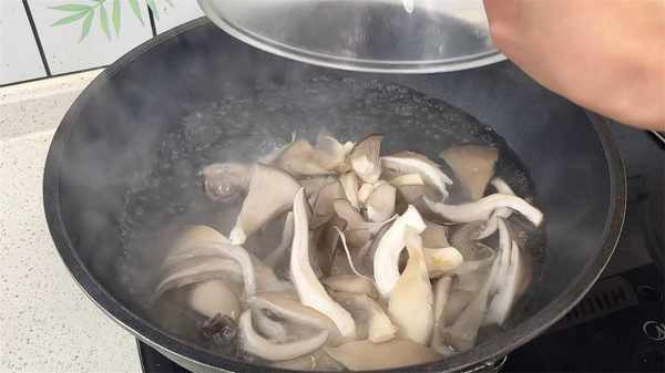 1、平菇切掉根部掰成小朵,煮鍋中加入適量的清水煮開,焯水1分鐘撈出控幹水分。