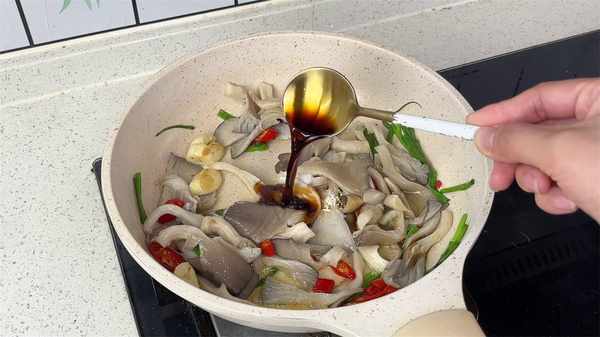 準備食材:平菇,雞蛋2個,小米椒、小蔥、大蒜,2勺生抽,適量的鹽和雞精。
