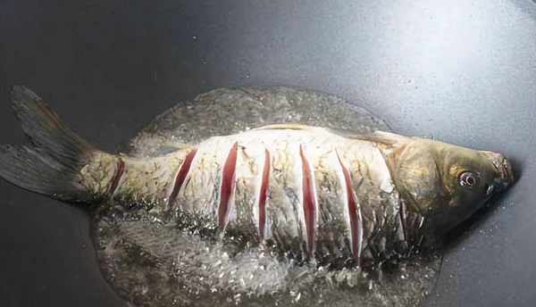 然後把鍋燒熱,放上一大勺的油潤鍋,把鍋潤好後,把油倒出去,再放少許的底油,撒上一把鹽,這樣能防止煎魚的時候粘鍋,然後把醃制好的鯉魚下鍋,兩面各煎二分鐘,把魚皮表面煎至金黃後倒出來備用。