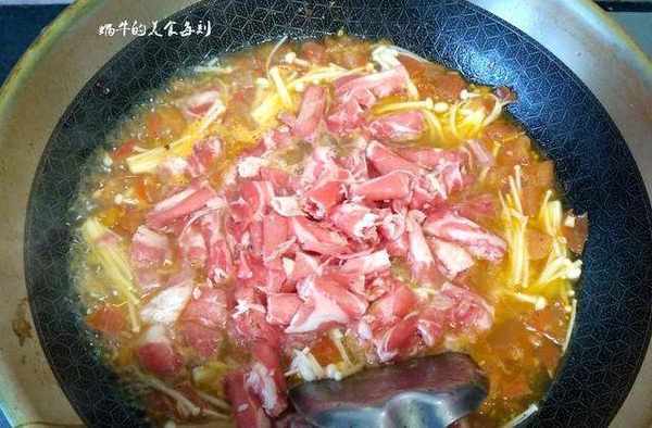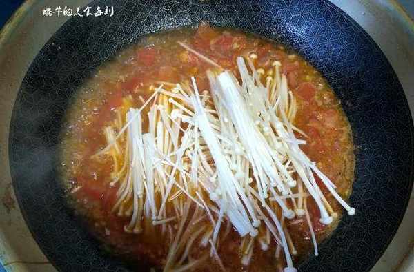 鍋中倒入少許油燒熱,下薑蒜末炒出香味,接著倒入切碎的番茄,中小火翻炒出番茄汁,加入一大碗溫水煮開,加入2勺番茄醬,1勺蠔油,少許鹽,適量白糖調味,然後把金針菇洗幹凈放入番茄湯中,煮開後煮2分鐘。