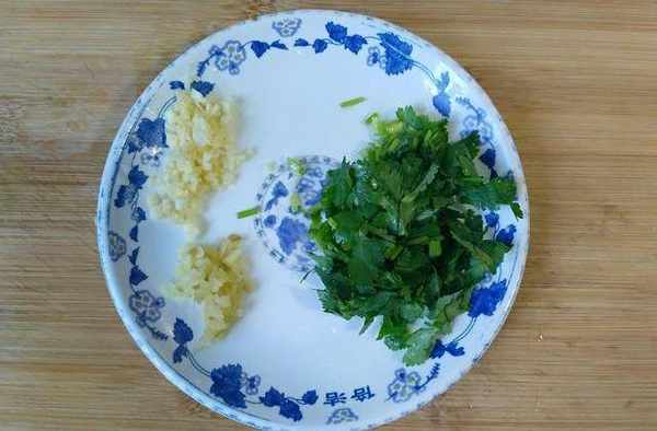 香菜洗幹凈切小段,薑蒜切成末,金針菇切去根部,用淡鹽水浸泡一會兒。