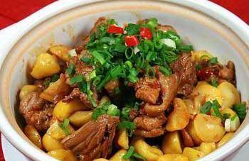 2、冰糖少許,不用放的太多,放進油鍋裡加熱融化,出焦糖的氣味,加入蔥薑段,慢炸一會出香味,這時加入控水的雞塊,加入去殼的板栗。
