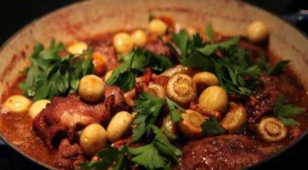 食材:雞腿 5個、培根 5片、蘑菇 12個、洋蔥 1個、胡蘿卜 1根、百裡香 3根、月桂葉 3片、紅酒 500毫升、雞湯 250毫升、白蘭地 50毫升、西紅柿膏 3湯匙、中筋面粉 2湯匙、鹽 適量、黑胡椒 適量