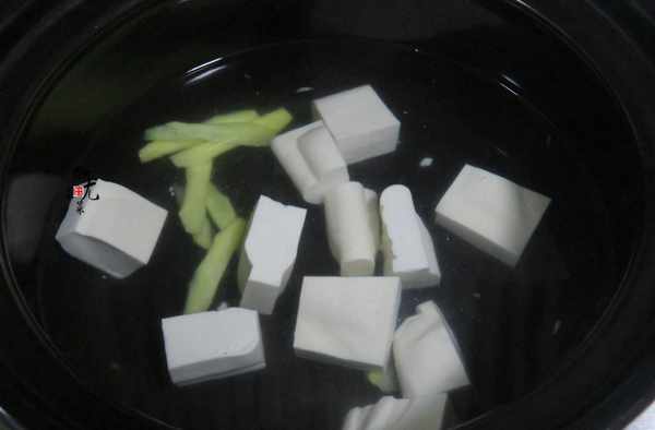 5、接著砂鍋裡加入一盆清水,薑片和豆腐塊開大火煮開。