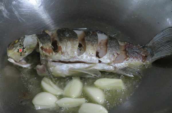 4、直至煎到鯽魚表面微黃,再放入大蒜爆香。