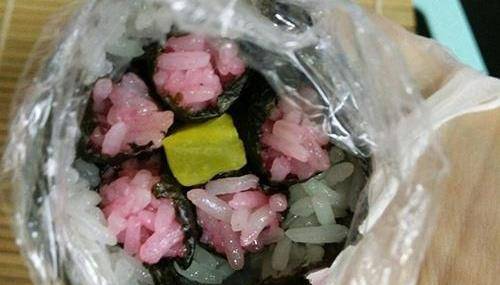 3、把1條日本蘿卜條放在5條海苔小卷中間,用一張大的海苔卷在一起。壽司簾鋪上一層保鮮膜,另外一張海苔鋪上一層白米飯,抹上適量的沙拉醬中間放好卷好的櫻花海苔卷,將壽司卷緊,前後均勻的輕輕地捏緊。保鮮膜不要取下,將壽司放在卷連中,卷圓,隻漏出要切的部分。刀子沾白開水,每切一片,沾一次水,這樣切出來才幹凈!