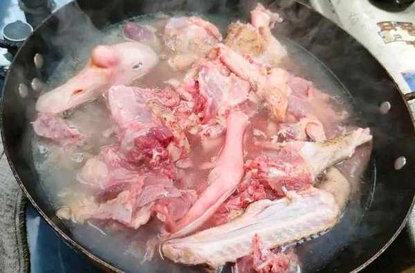 2.把洗凈的大鵝剁成塊,放入清水中浸泡,中間多換幾遍水,直至水變得清澈後把鵝肉撈出控水,然後涼水入鍋燒開後撇凈浮沫撈出沖洗幹凈。