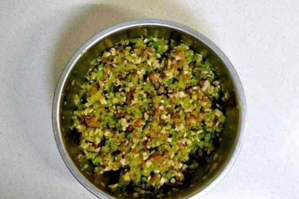 第三步:將芹菜和香菇幹切碎,加入剛撈出的豬肉餡拌勻。拌好後加少許油和鹽,這樣包出來的餃子更香軟。和好餃子後,就可以開始包餃子瞭。