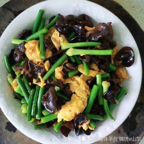 1、 蒜苔洗凈去葉硬根,木耳用溫水泡發,去掉硬根,雞蛋中加入少許鹽和白胡椒攪勻。