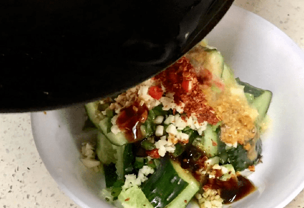 正確的做法應該是,先把切好的黃瓜放到盤子裡,接著再往盤子裡面倒入適量的蒜末、花生碎、辣椒碎、食鹽、花椒粉、香油、食醋以及生抽,攪拌均勻至入味,接著起鍋熱油,當油溫達到七成熱的時候,把熱油淋在黃瓜上,然後攪拌均勻。