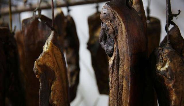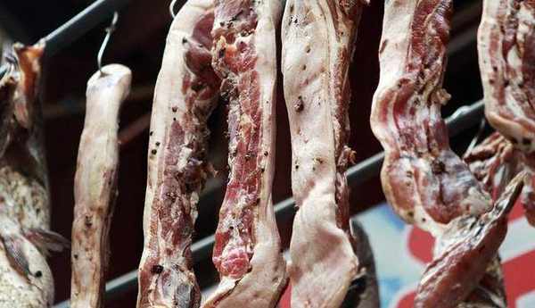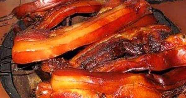 5.醃制結束後,取出肉條用棉線穿上,掛在太陽下,用筷子把皮從上到下刮一遍,這樣會好看一些。掛在太陽下先曬兩天,把水汽曬幹一點。肉曬的也差不多瞭,就準備熏肉用的料,橘子皮和米糠,茶枯餅.茶枯餅熏出的肉非常的香.大約的熏15天的時間,臘肉就熏好瞭.熏好的臘肉是紅黃紅黃的,格外誘人。為瞭使臘肉散熱,能夠把臘肉掛起來,避免由於不透風使臘肉產生異味。需要吃的時候切一小塊下來炒著吃或者蒸著吃,肥瘦相間的臘肉最好吃瞭一點都不油膩,還散發著肉香。