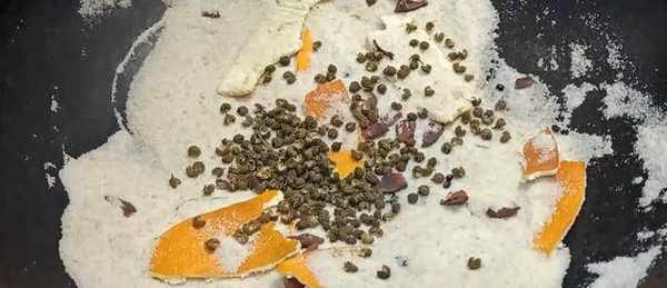 2.炒調料:12斤肉放4兩鹽,3顆八角,1小把新鮮橘子皮。