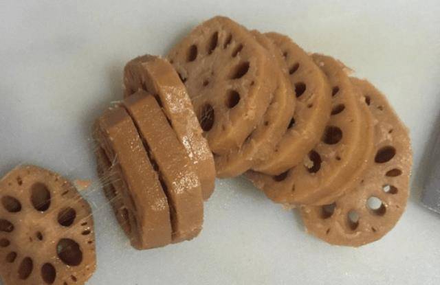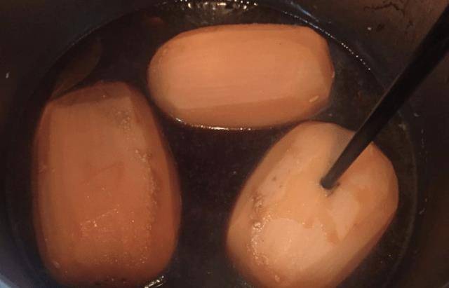 第四步:時間到瞭,慢慢撈出蓮藕,放入鍋中燜10分鐘左右,入味更佳!等蓮藕燉得差不多瞭,馬上拿出來,用刀把蓮藕切成小塊裝盤待用!