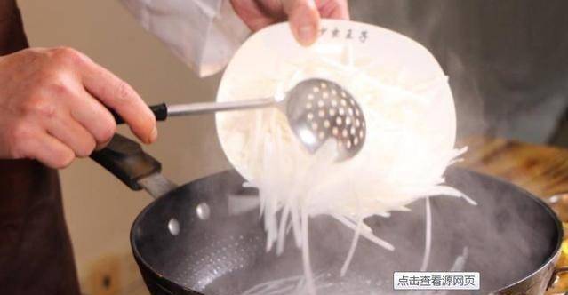 3、因為蘿卜絲做起來非常簡單,大傢一定要註意哦。燙的時候不要煮太久,否則很容易熟。鍋裡的水燒開後,放入蘿卜絲,稍等片刻即可取出。