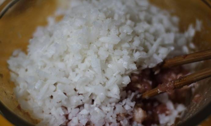 5、白蘿卜洗凈切小方塊放入肉餡中;