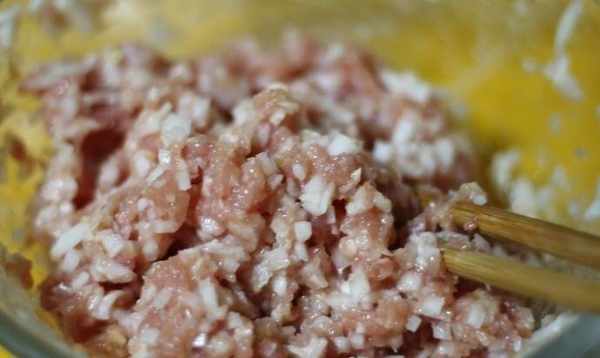 3、餡料加入黃酒汁去腥。如果沒有黃酒汁,可以用料酒或優質白酒代替;