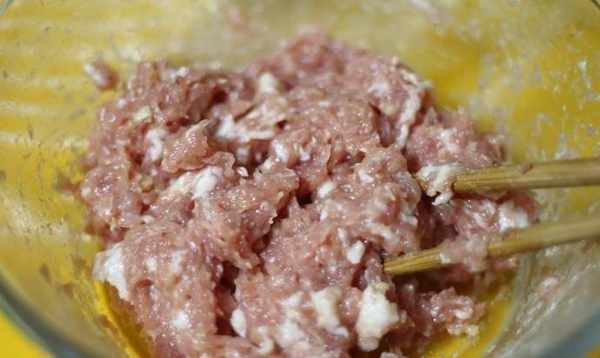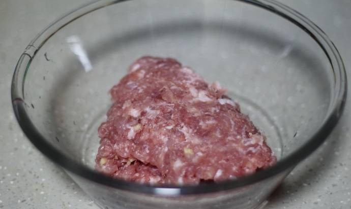 3.將洗凈的豬肉和生薑混合,切碎,放在幹凈的大碗裡。如果怕麻煩,買肉的時候可以用料理機攪拌或者讓屠夫幫你剁;