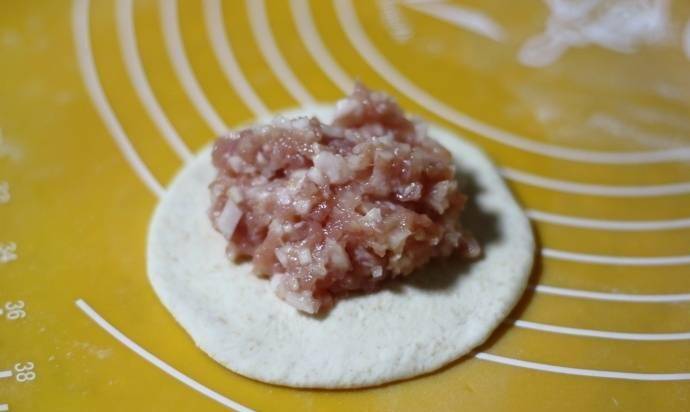 9、取一個小面團,用搟面杖搟成圓形,在搟好的面團中間放上適量的餡料;