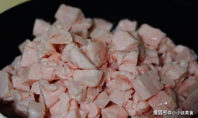 2、豬油用刀切成3厘米左右的塊,全部切成塊,放入鍋中,同時鍋中倒入半容器水,開煤氣灶;