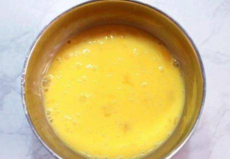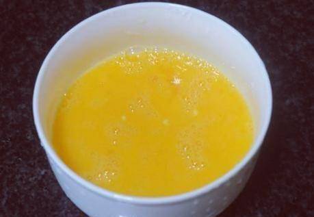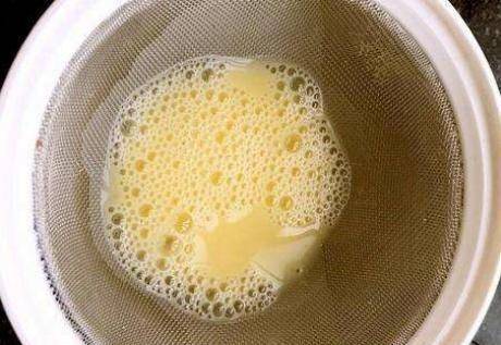 第三步再次攪拌均勻,讓蛋液和水完全融合。這時候用濾網將炒蛋液過濾一次。如果表面有小泡沫,用篩子清洗;