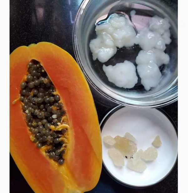 準備食材:木瓜500克、雪蛤5克、枸杞5克、牛奶100毫升、冰糖15克