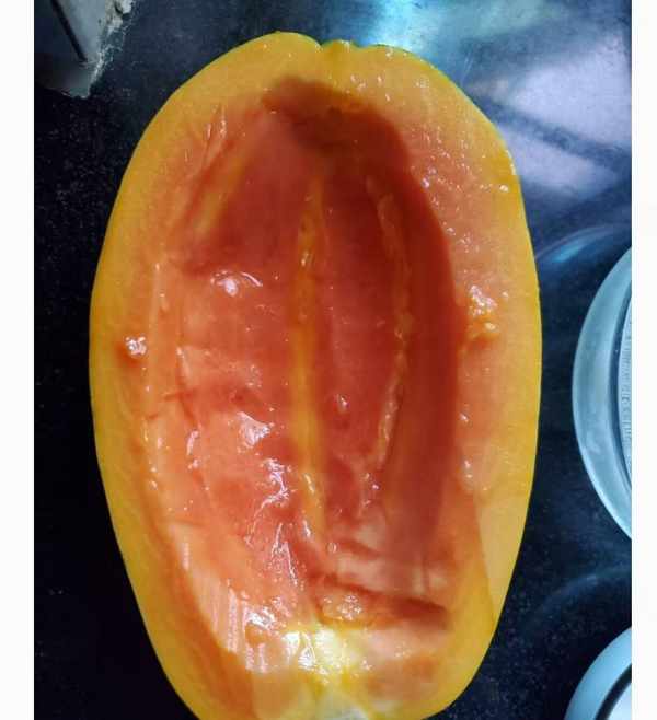 2、切開木瓜頂部三分之一處,挖出木瓜籽作為容器