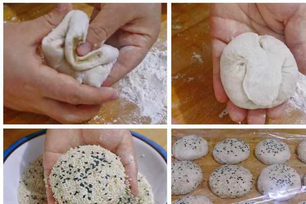 7、取一個劑子,輕輕扯長一點,向裡折疊2下,拇指捏住中間,用虎口把兩端收攏,整理成一個圓餅。做好後抹一點清水,粘一層生芝麻,芝麻是燒餅的標配,買的燒餅上芝麻非常少,自己做可以多粘些。全部做好後蓋上保鮮膜餳5分鐘。