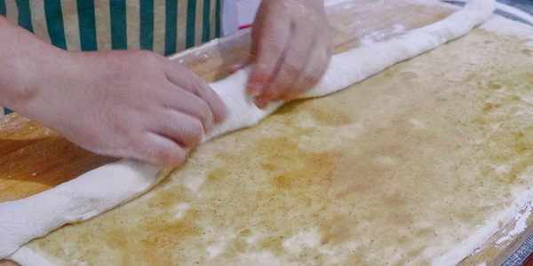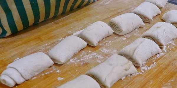 6、搟好之後,抹一層油酥,愛吃小蔥的還可以撒少許蔥花,再從一邊緊緊卷起來。卷好後切成10個小劑子。