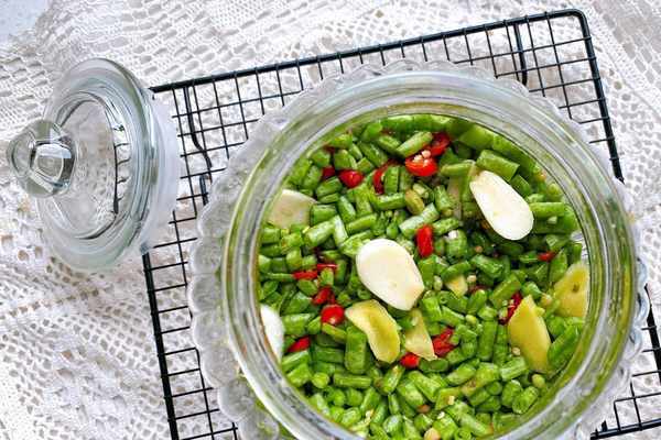 3、攪拌均勻的豆角裝在無水無油的罐子裡面,有大罐子就裝在一起,沒有大罐子可以分裝在小罐子裡面,裝的時候要稍微壓緊實一些,壓好之後蓋上蓋子密封保存;
