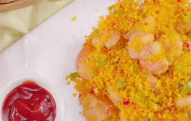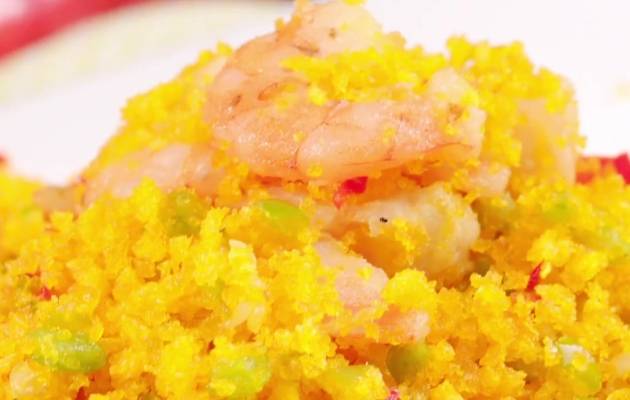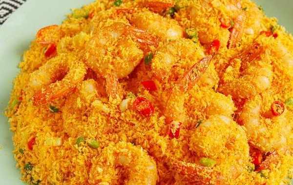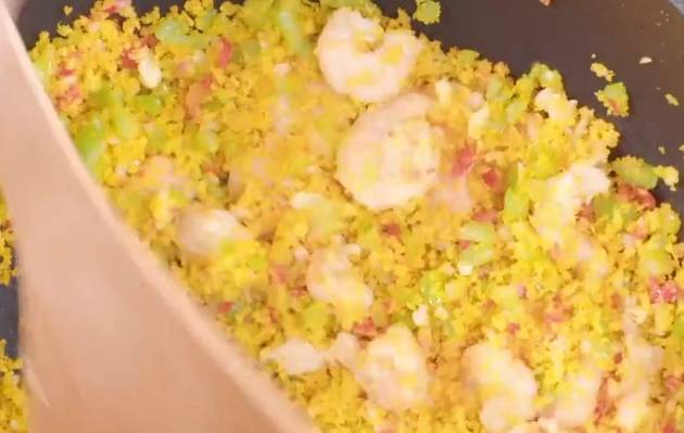 它的外形金黃有致,之中摻雜瞭青紅菜椒的紅綠色澤和鮮蝦的嫩白。