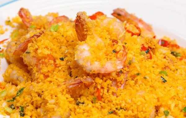 【準備原料】:面包屑100g,鮮蝦30隻,淀粉25克,青紅菜椒各一個,雞蛋2個,蒜末少許。