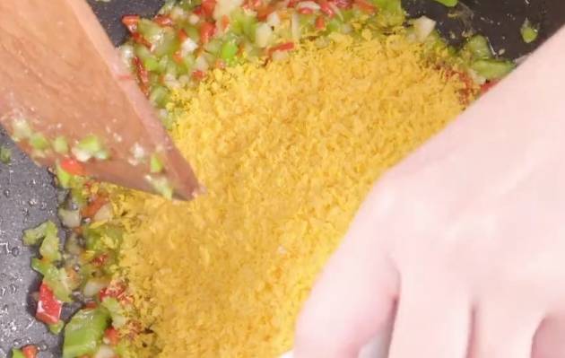 第四步:另起鍋加適量的油,先倒入蒜末爆香,再把切碎的青紅菜椒倒入鍋中,適當翻炒一分鐘後,倒入準備好的面包屑,再次翻炒一分鐘。