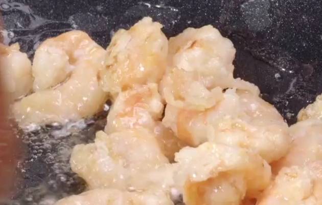 第三步:鍋中加入適量的油,五成油溫倒入裹好淀粉的蝦仁,然後用中火翻炒至周身泛白,盛出備用。