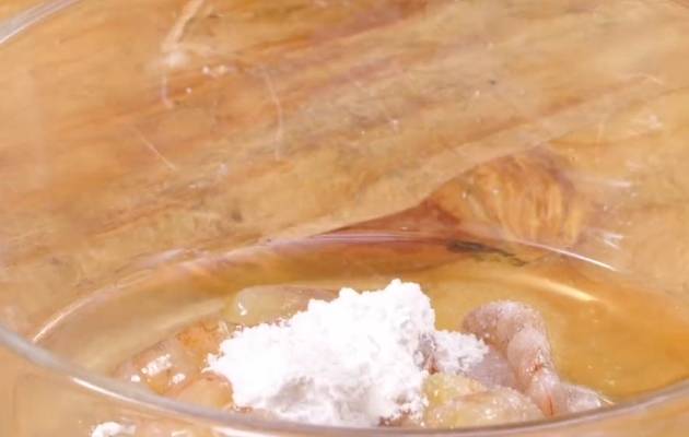 第二步:把準備好的淀粉倒入醃制好的蝦仁碗中,反復翻拌,均勻裹制。
