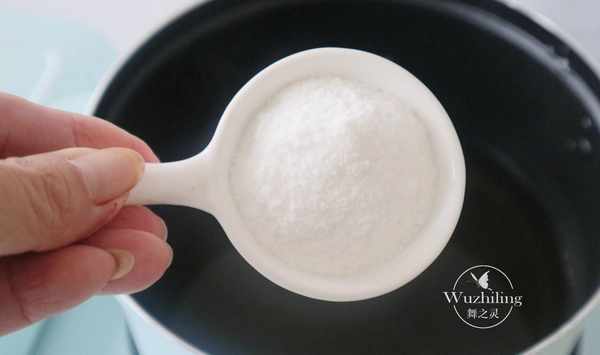 第三步:轉中小火,將15克的涼粉倒入,用勺子攪拌融化。