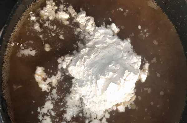 然後給綠豆湯內加適量奶粉或者牛奶,給綠豆冰棍增加奶香味。再加一大勺糯米粉,攪拌均勻,防止粘鍋要不斷攪拌。