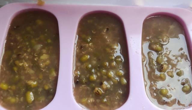 綠豆湯涼下來後,將它們分裝進模具裡,裝好後放上雪糕棍,再放進冰箱內冷凍。