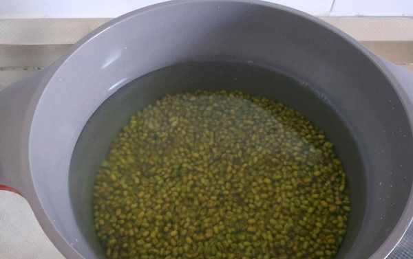 將適量綠豆放進碗中,加水清洗兩遍,再加清水浸泡幾個小時,泡脹的綠豆非常好煮,可以節約煤氣,煮出想要的口感,若是用高壓鍋直接壓的話,掌握不好時間,綠豆開花太大脫皮瞭就不好吃瞭。