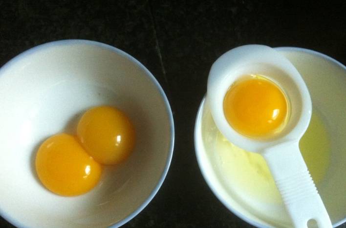 第一步:準備3個土雞蛋,雞蛋一定要新鮮,蛋黃不能散,這樣做出來的冰淇淋才好吃,我們用雞蛋分離器把蛋清和蛋黃分離開,隻要蛋黃,蛋清放一邊另用。