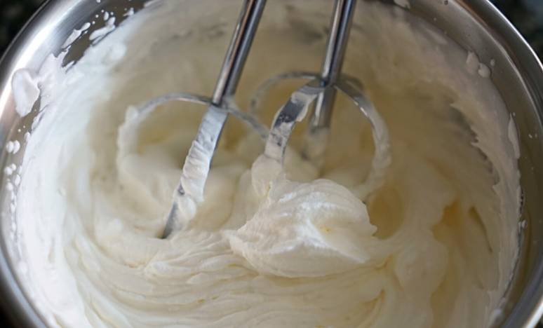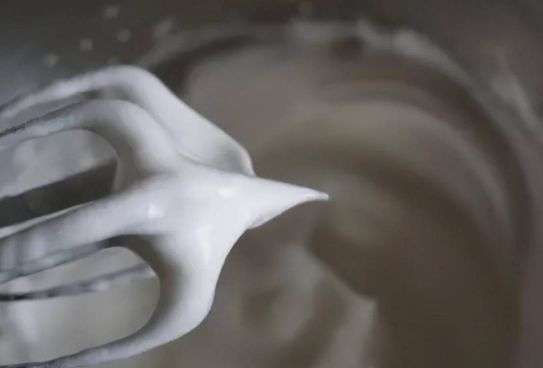 這個必須用電動打蛋器打,手動的不行,電動的打3-4分鐘就可以瞭,手動的20分鐘不一定打得好。打至奶油出現明顯的紋路就可以瞭,可以把打蛋器提起來,淡奶油不往下流動,也說明是打好瞭。