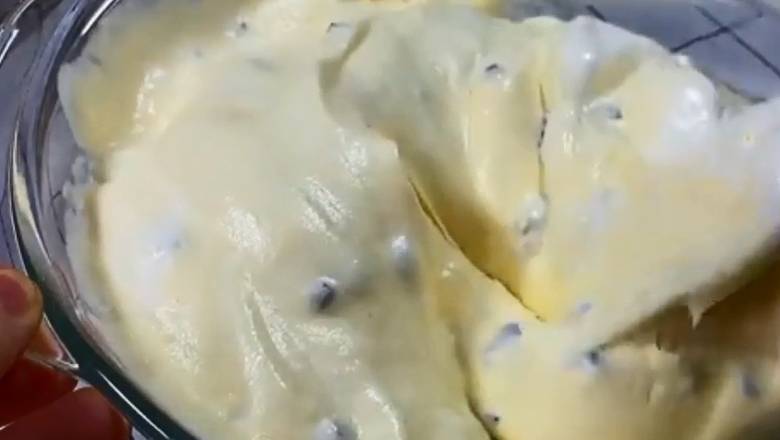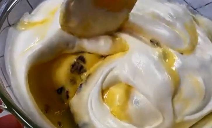 第三步:放一把蔓越莓幹到蛋黃中,然後把打發好的3/1的奶油也加入進來,攪拌均勻,