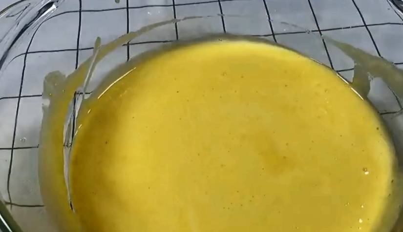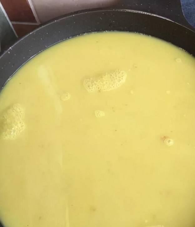 加熱到鍋裡的牛奶蛋黃開始吐泡泡的時候關火,倒入碗中放涼備用。