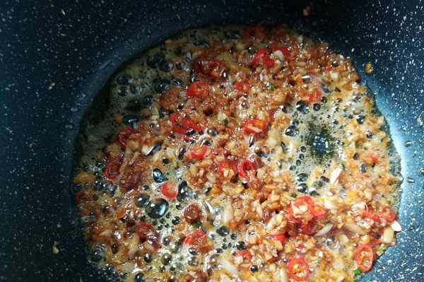 5.小鍋燒熱放油,轉小火,放入蒜末和小米椒翻炒出香味。建議用這種小鍋,放油少一點也好翻炒。
