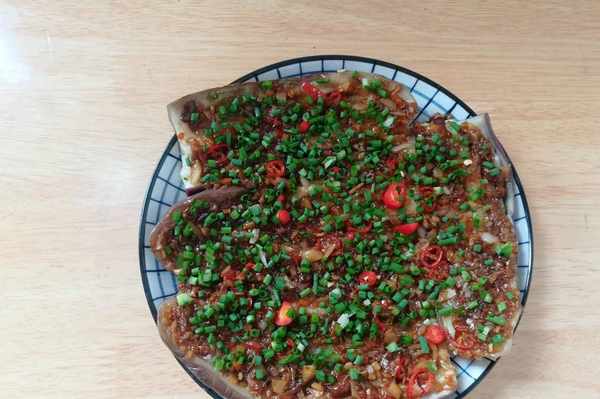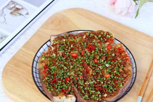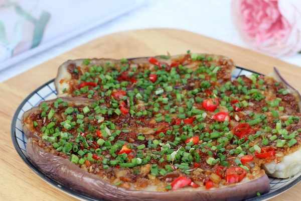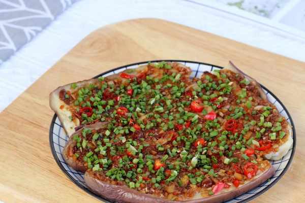7.煮好的蒜蓉用勺子舀到茄子上,均勻地抹平,撒上蔥花和剩下的辣椒,一道蒜蓉蒸茄子就做好瞭。