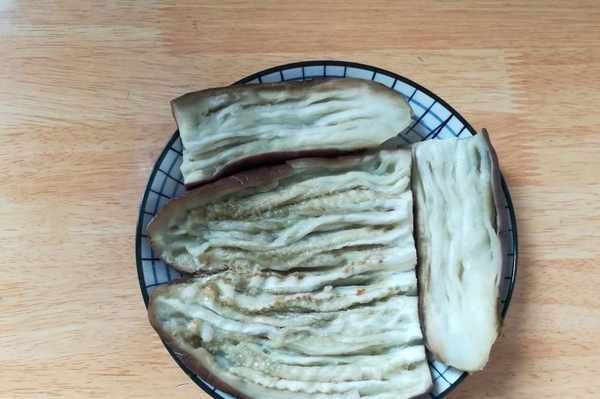 4,茄子蒸熟取出來,去掉茄子柄(一開始忘瞭去掉),用筷子在茄子白色的瓤上劃拉幾下,放涼備用。