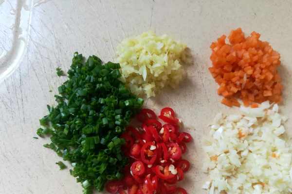 3.蒸茄子的時候,把蒜米去皮切末,胡蘿卜削皮切碎,生薑去切末,小米椒切小段,蔥花隻要葉子部分切成小段。