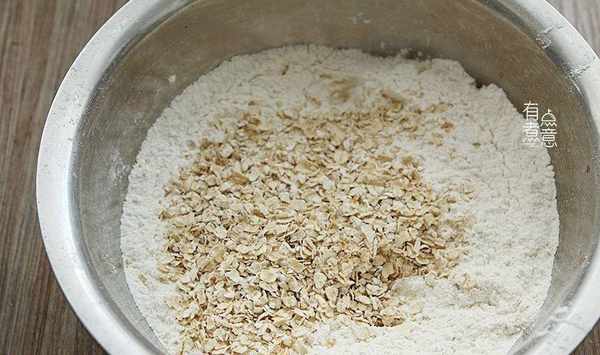 2、將面粉放入大盆子裡,放入燕麥片,燕麥片最好就是這種即食燕麥片,比較容易熟,如果要用那種煮的燕麥片需要先把麥片泡軟。