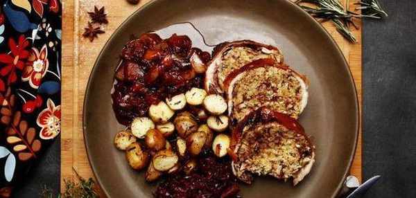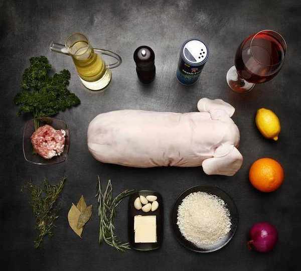 配料:乳豬一隻,洋蔥兩個,蒜瓣適量,黃油、橄欖油適量,豬肉餡兩斤,面包碎300克,檸檬一個,橙子一個,白蘭地200毫升,法香100克,芹菜一根,胡蘿卜一根,白葡萄酒200毫升,蘋果2個,桃子2個,八角3個,紫甘藍一個,土豆800克,小茴香20克,香葉6片,鹽適量,黑胡椒適量,迷迭香和百裡香適量,黃糖100克,檸檬汁20毫升,醋10毫升,肉桂、豆蔻適量。