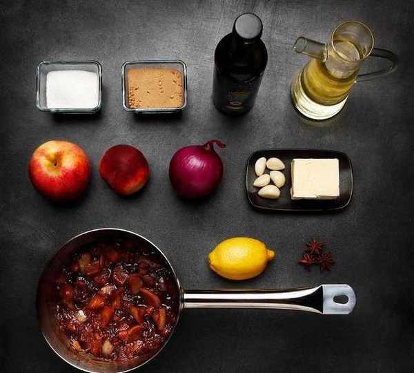 步驟三:鍋中放油加熱,然後把,洋蔥絲、蒜片、蘋果塊、黃油、醋、桃子塊、一顆八角橄欖油、紅糖一起煮十五分鐘,最後攪拌成醬。